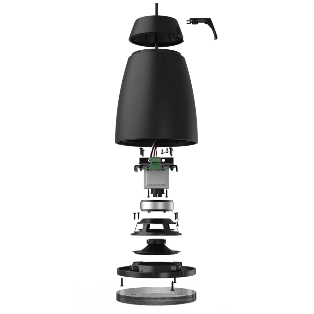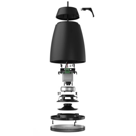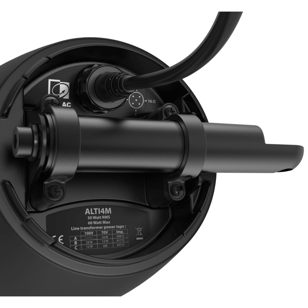 The ALTI6M is a variant of the ALTI pendant speakers, featuring a die-cast mounting bracket for wall & ceiling mount purposes. This allows the same audio system design and identity throughout the entire installation in case some areas are not allowing pendant solutions being used due to the ceiling heights or structures. Acoustics and construction are identically crafted, while connections are made through weatherproof AWX5™ connectors, this construction has an IP65 rating.